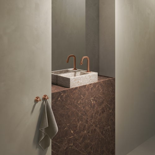 Gekleurde kranen en accessoires: brons en grijstinten in de spotlights