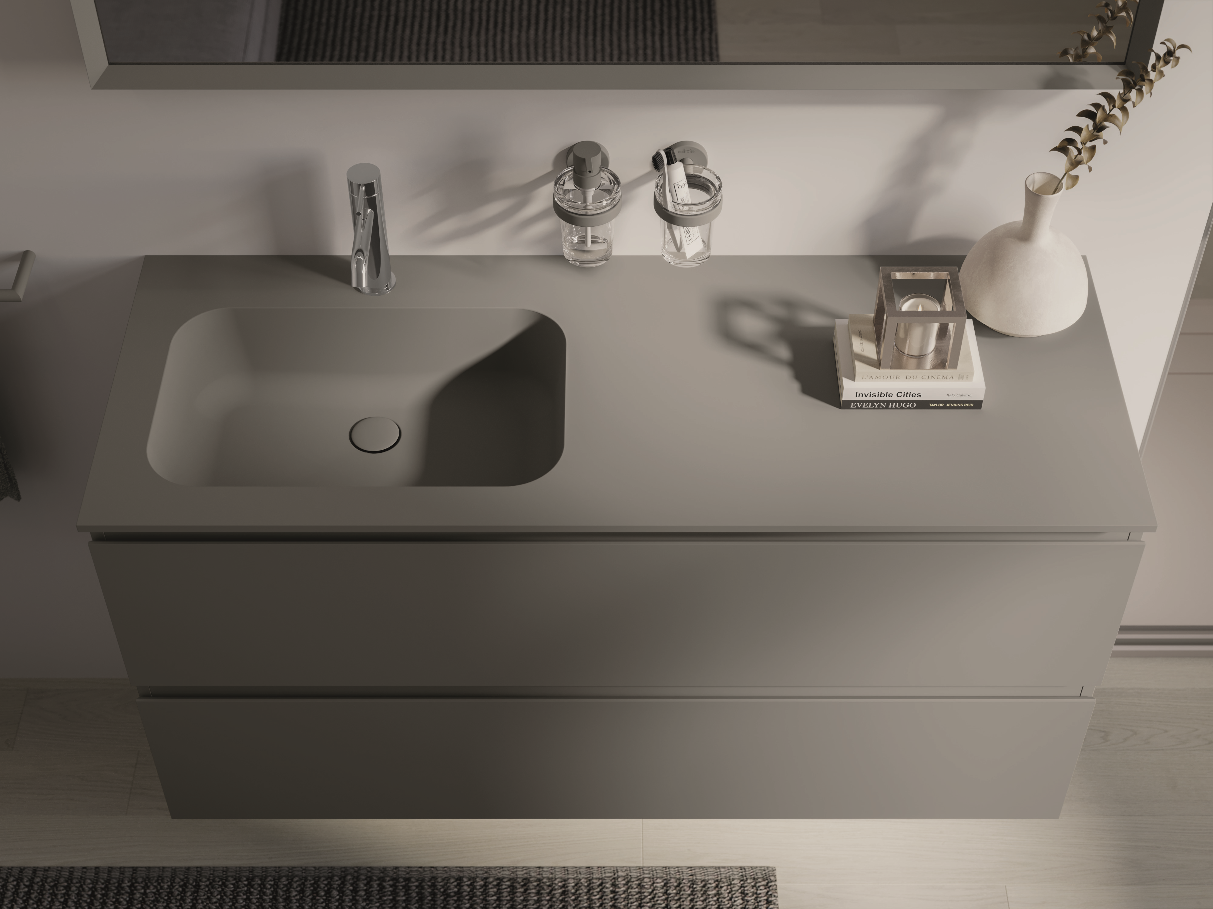 - Het Sanijura Infinie-meubel combineert een dik HPL-blad met subtiele opbergruimte eronder, en is beschikbaar in een brede waaier aan afwerkingen: van zachte uni-kleuren tot natuurlijke houtstructuren en stone effects.